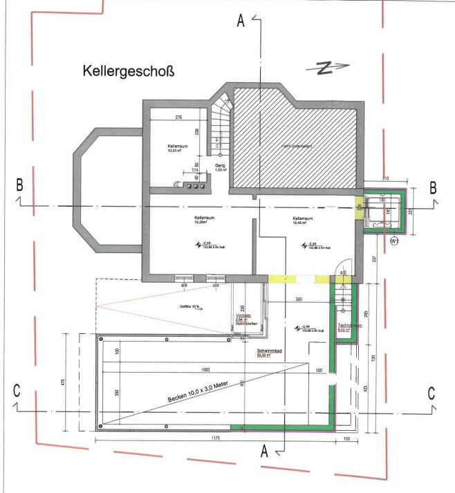 In the basement, there is a utility room, a heating room, a storage room, as well as access to the wellness area.
