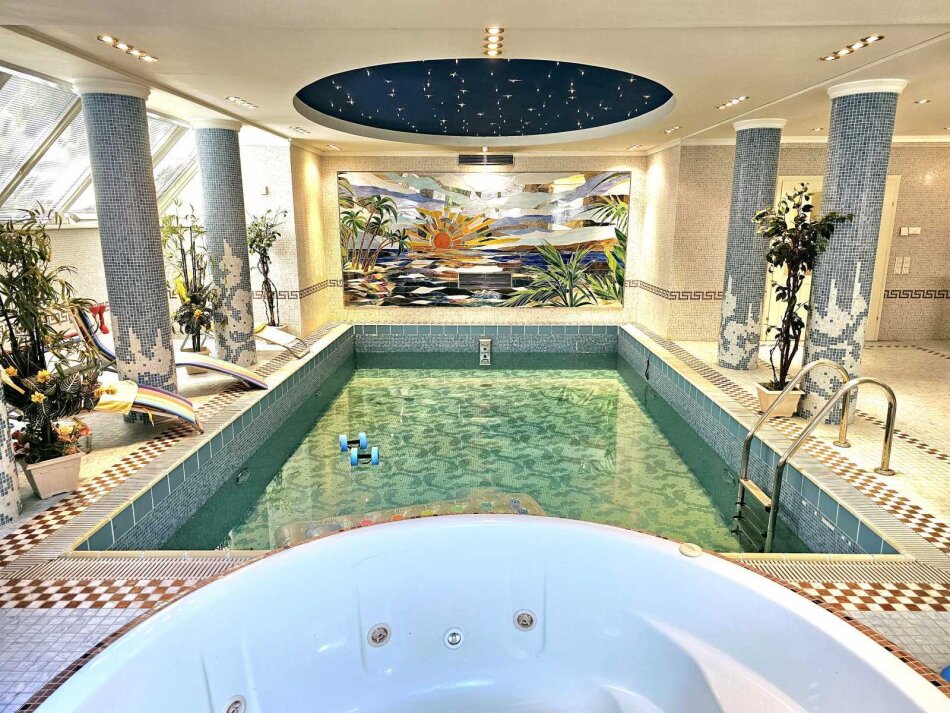The pool area is adorned with refined mosaic designs and a starry sky motif