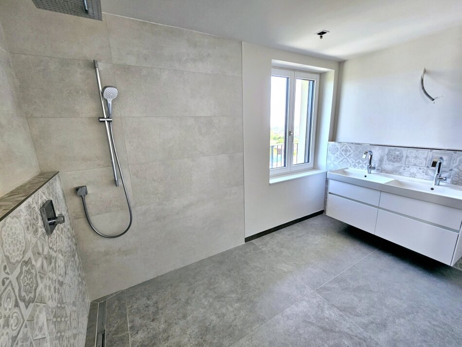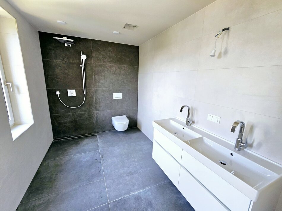 Fittings, among others, with Hans Grohe Raindance head showers, thermostat fittings, washbasin cabinets, freestanding bathtub (V&B Architectura)