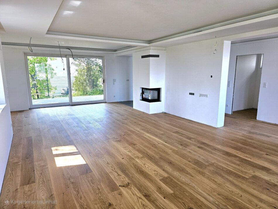 Spacious living-dining room with fireplace, beautiful views, and access to the approx. 21 m² large south-facing garden terrace.