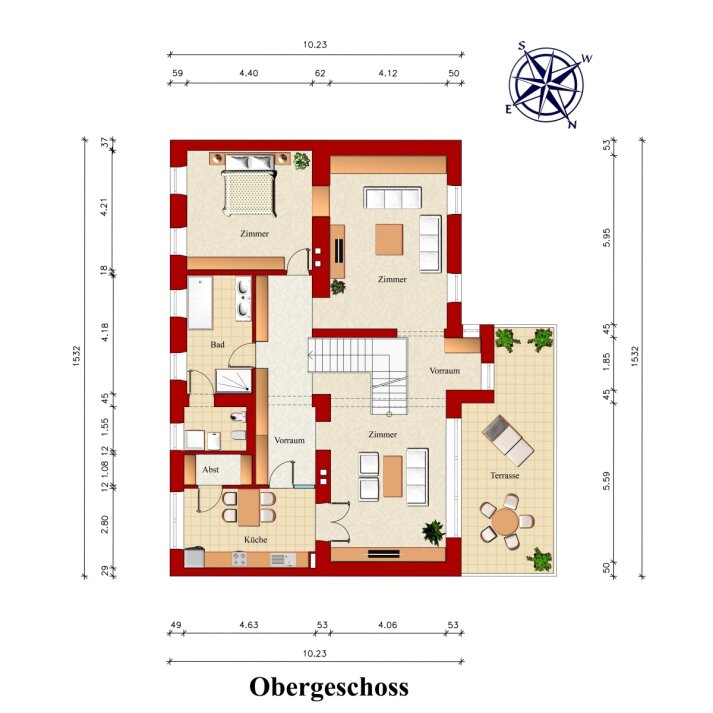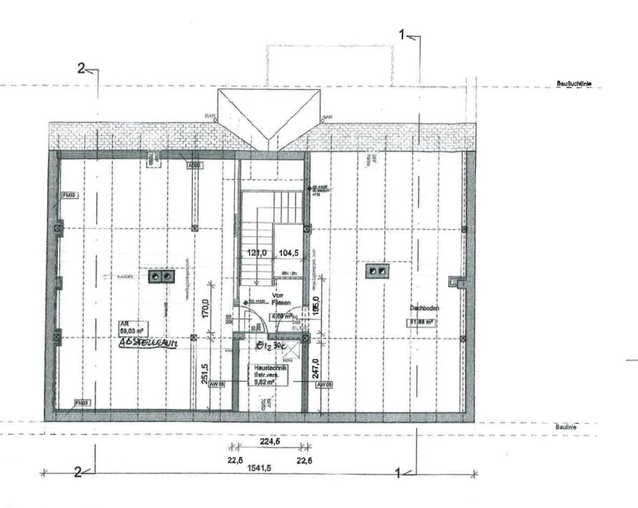 The attic (=half attic with 69 sqm) is prepared for expansion. Here, 2 – 3 bedrooms and a bathroom can be built. 52 sqm in the attic are not developed.