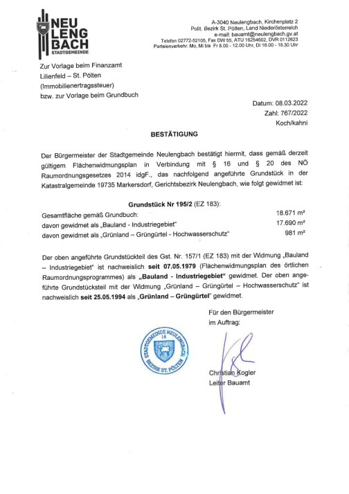 Nachdem er nur 2 km von der Trafostation im Zentrum Neulengbachs entfernt liegt eignet er sich auch gut für ein Fotovoltaikanlage. Auch zur Autobahnabfahrt Altlengbach sind es nur 6,4 km oder 8 Fahrminuten.