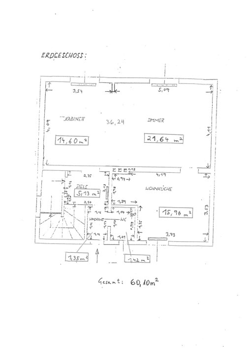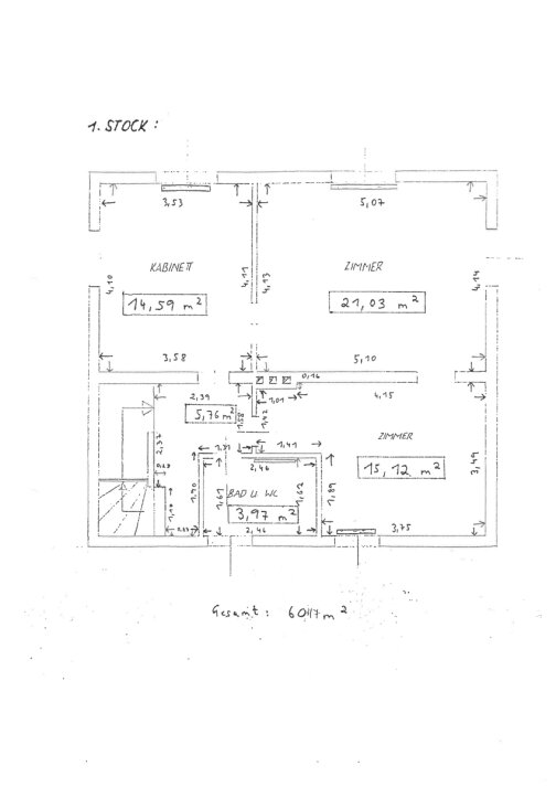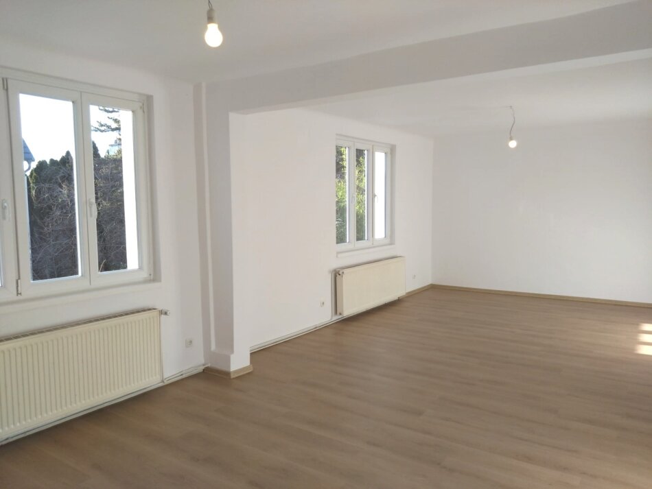 Im sonnigen Obergeschoß sind 3 große Zimmer, ein Bad mit Badewanne und ein WC.