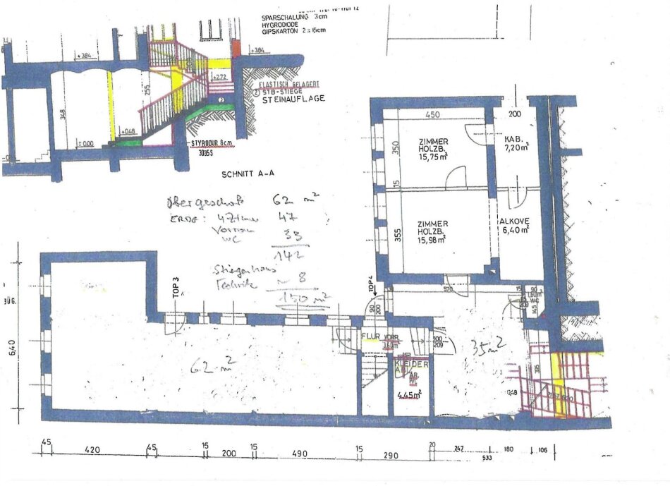 Das zur Vermietung vorgesehene Obergeschoß besteht neben einem Vorraum mit einer zusätzlichen kleinen Abstellkammer aus einem einzigen sehr großen Raum mit 62 m².