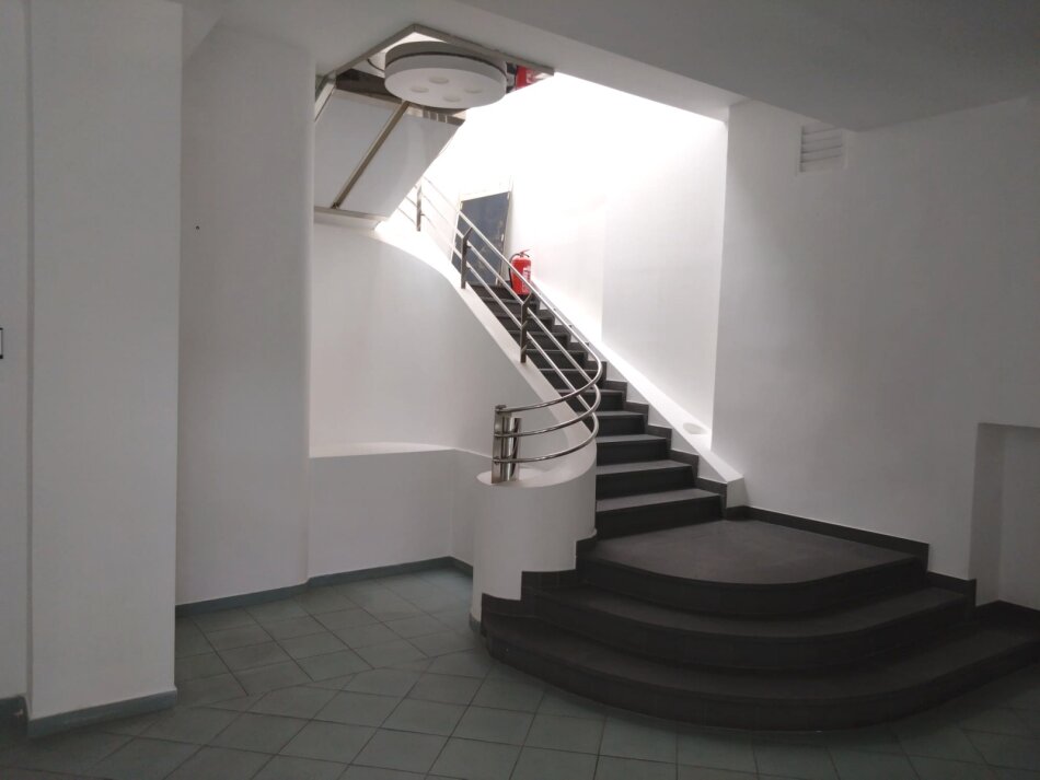 Der ebenerdige Teil des Büros ist über eine kleine Stufe zu begehen und befindet sich daher ca. 1,5 m über dem Niveau des Hofes.