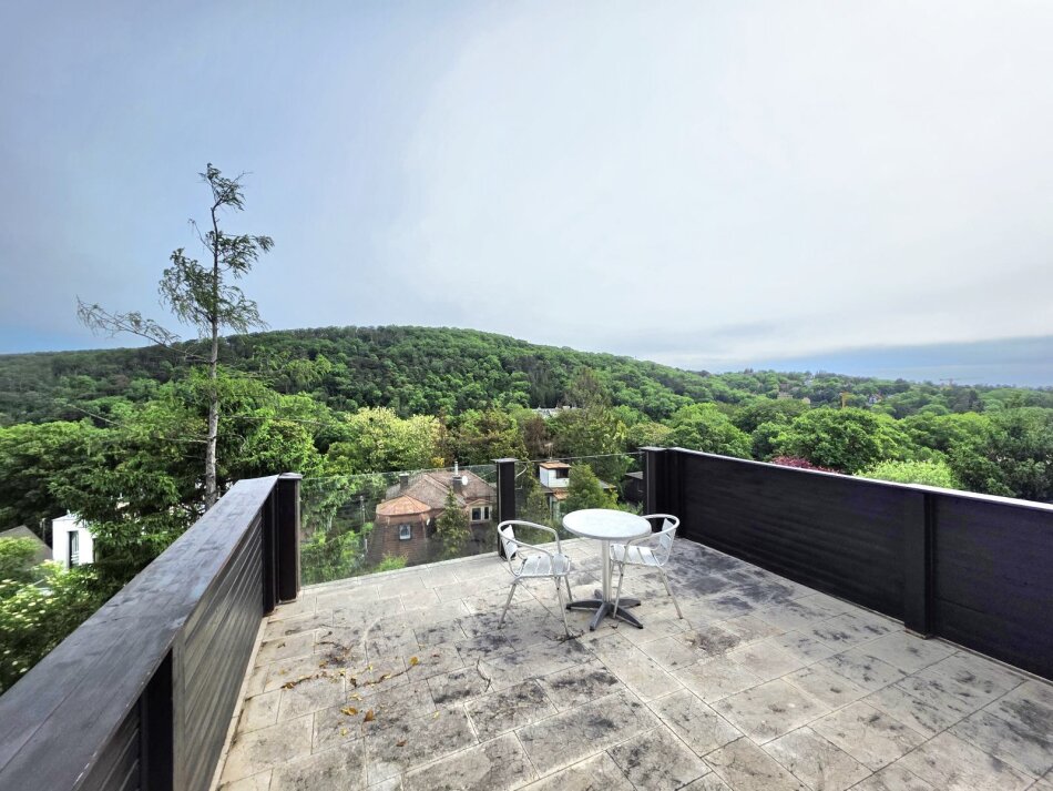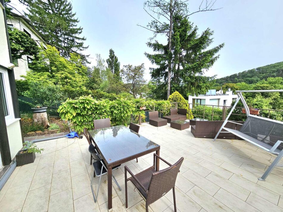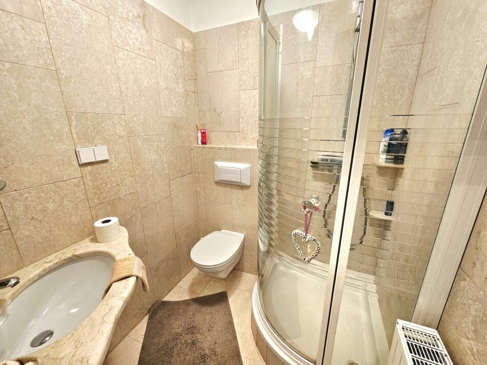 In the basement, you will find an impressive living-kitchen area of over 60 m². The modern kitchen with a generous kitchen island and adjacent dining area is ideal for creating culinary delights and entertaining guests in style. The cozy living area, surrounded by three window fronts, offers a stunning view of the Vienna Woods. On the spacious terrace of about 76 m², you can enjoy the picturesque surroundings all year round. A guest room, currently used as a wellness area with a modern sauna, a guest toilet with a shower in elegant marble, and a practical storage room complete this level.