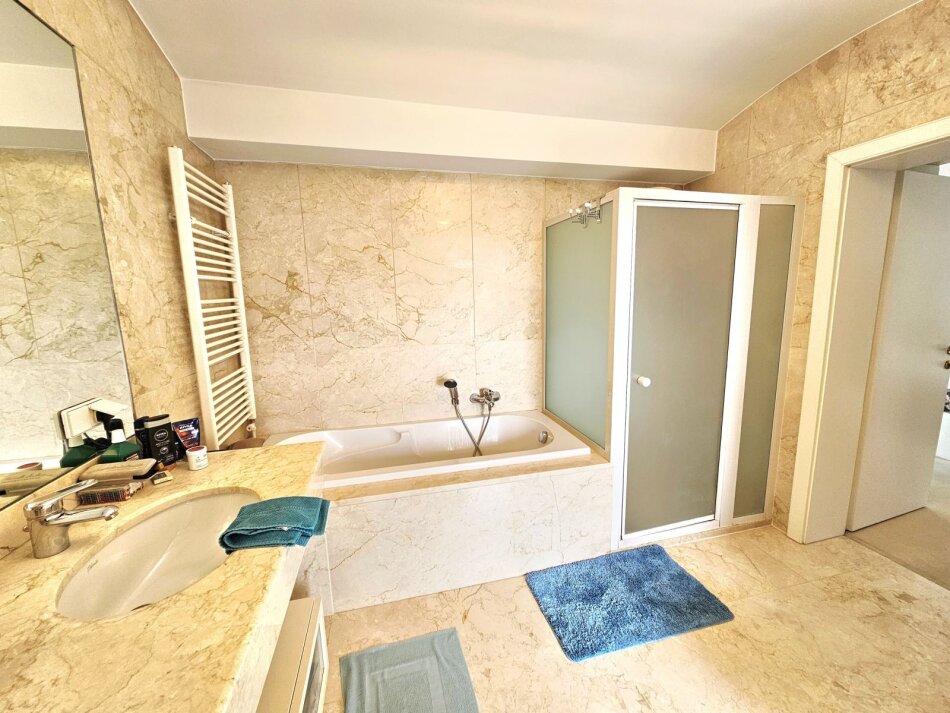 Im Obergeschoss erwarten Sie ein modernes Marmor-Badezimmer und drei einladende Schlafzimmer. Eines der Zimmer bietet Zugang zu einer ca. 17 m² großen Sonnenterrasse.