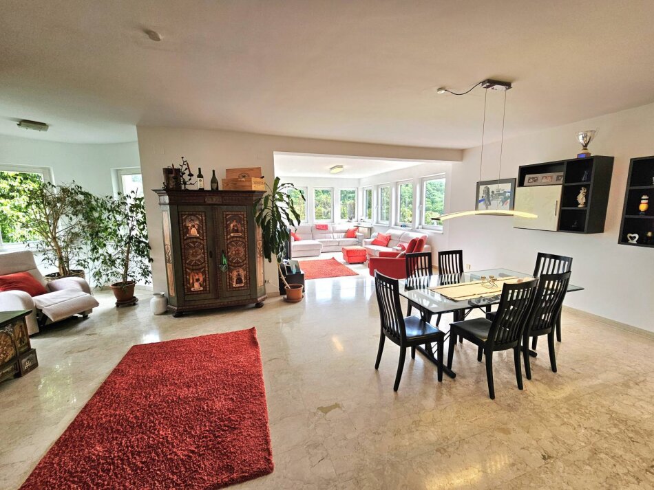 From the central entrance hall, you can reach the generous living area with integrated dining area, elegant fireplace, and breathtaking green and distant views via the elegant marble stairs! Additionally, on this level, you will find a spacious office, with connections for another kitchen for two-family use, a practical guest toilet, and a garage.