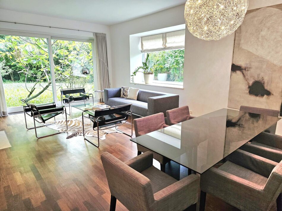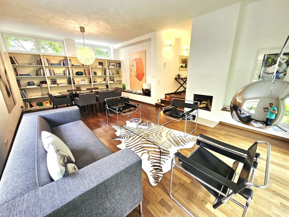 Ground floor: The open and light-flooded living area impresses with a modern kitchen with dining area, which provides direct access to the garden terrace. Here you can enjoy relaxed hours in the greenery while gazing at the well-kept garden. The living room features an open fireplace that creates a cozy atmosphere on cool days. A practical wardrobe room ensures order and storage space.